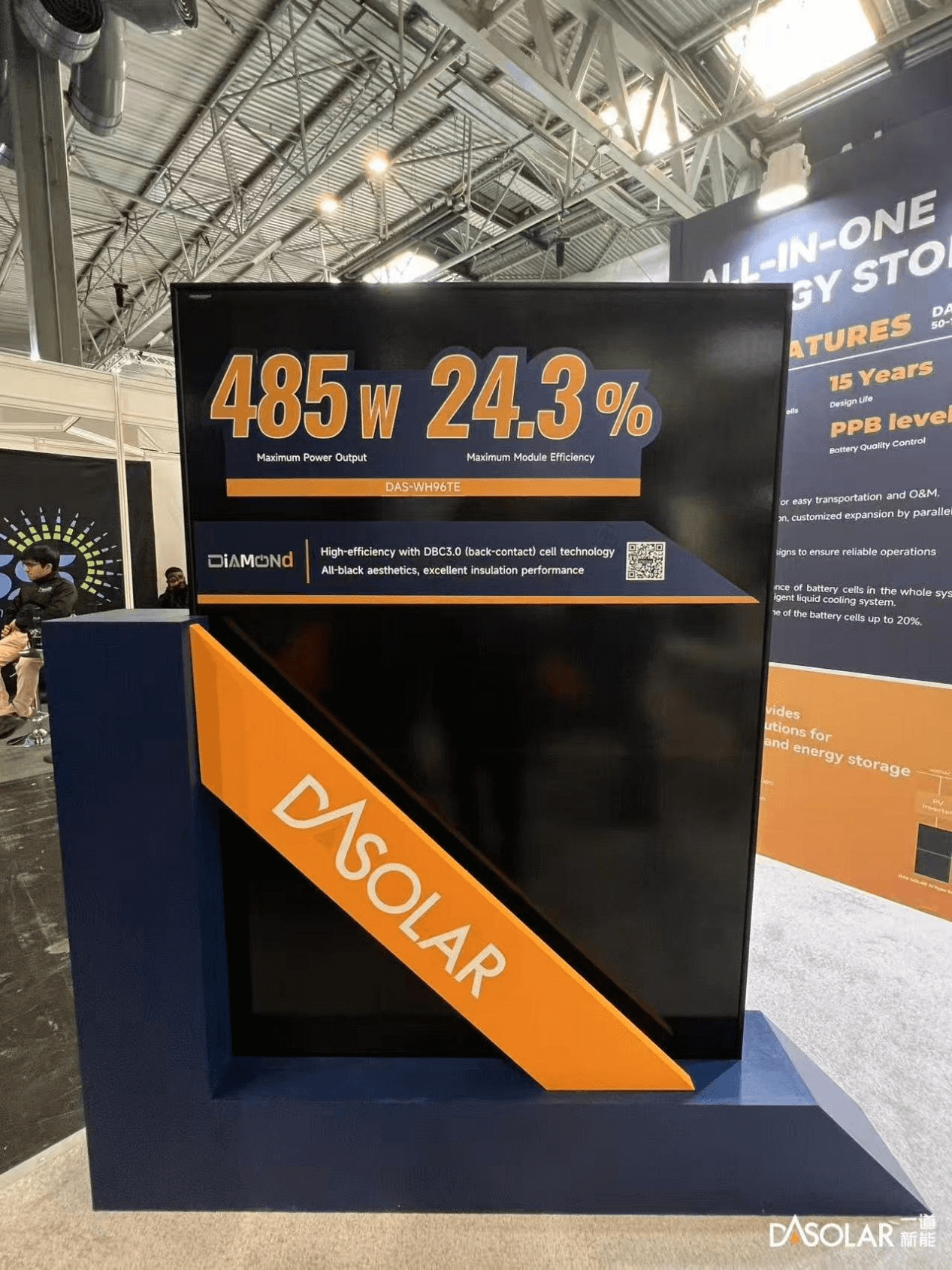 本次重点展出的485W DBC高效组件深度融合了TOPCon 5.0隧穿层技术与全接触钝化方案,实现了技术攻关领域的重大突破。组件正面无栅线的独特设计能有效避免正面栅线对光的遮挡问题,极大地提升电池的转换效率,当前,一道新能DBC 3.0 Plus电池效率成功超越27.77%,开路电压达745.7mV,组件功率突破670W,效率达24.3%,在细分场景需求中实现全生命周期最优综合发电量。同时,DBC组件全黑美学设计优雅融入建筑外观的同时能广泛适用于分布式项目,契合英国地区高端户用项目的美学需求。