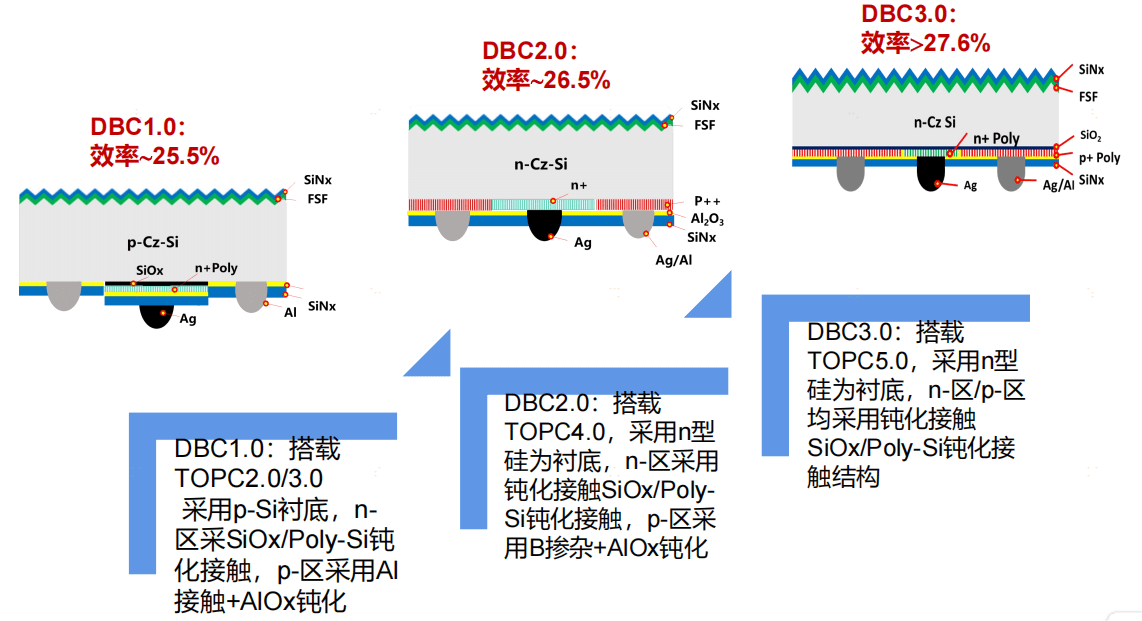 DBC1.0:奠定基础:搭载TOPCon2.0/3.0技术,采用p-Si衬底,n区以SiOx/Poly-Si实现钝化接触,p区采用Al接触+AlOx钝化,电池转换效率达25.5%,首次验证了TOPCon结构在BC电池中的可行性;