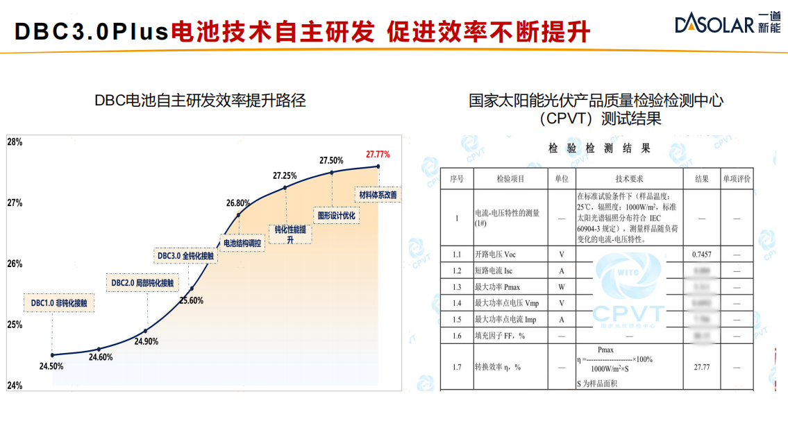 当前,一道新能DBC技术已迈入3.0Plus 时代,该技术基于 TOPCon5.0隧穿层技术,搭配选择性接触全钝化方案,电池效率成功超越27.77%,组件功率突破670W,效率达24.8%,在细分场景需求中实现全生命周期最优综合发电量。此外,DBC 3.0 Plus技术可与TOPCon 5.0工艺兼容,企业在不大幅改造现有产线的情况下,可实现BC电池的导入与量产,极大降低了技术切换的边际成本,为采取“有限试点、分步扩张”策略的企业提供了可行的技术路径。