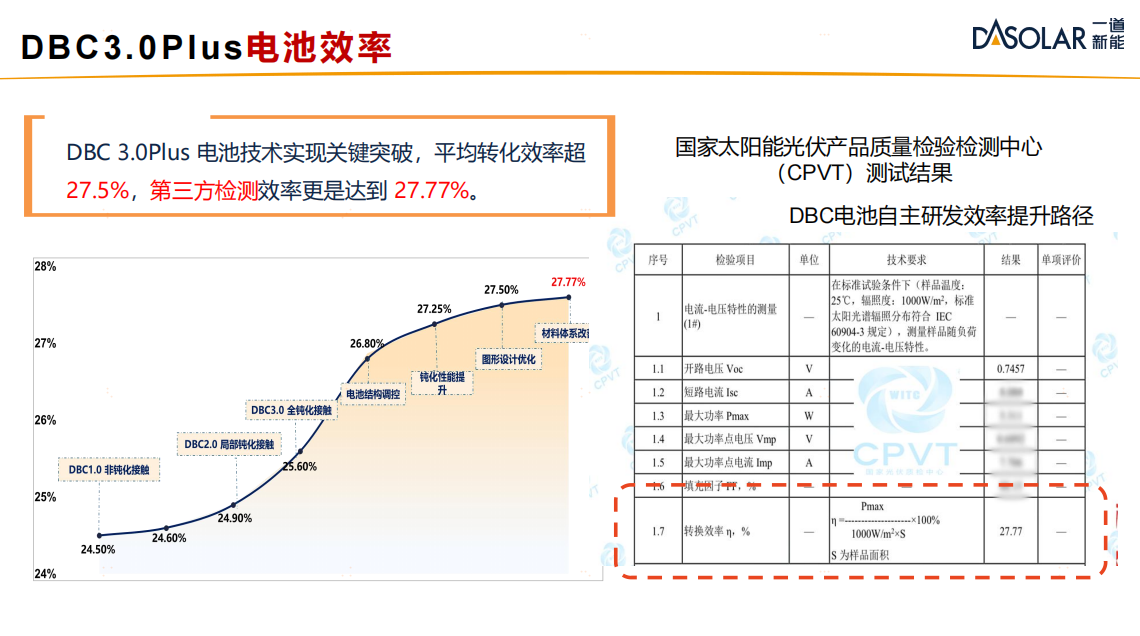 DBC3.0Plus技术成功破解高效、成本、量产的行业“不可能三角”,展现出极强的产业化适配能力。该技术完全兼容现有N型TOPCon生产设备,中试线平均效率稳定在27.6%,良率超96%,大幅降低量产转型成本。