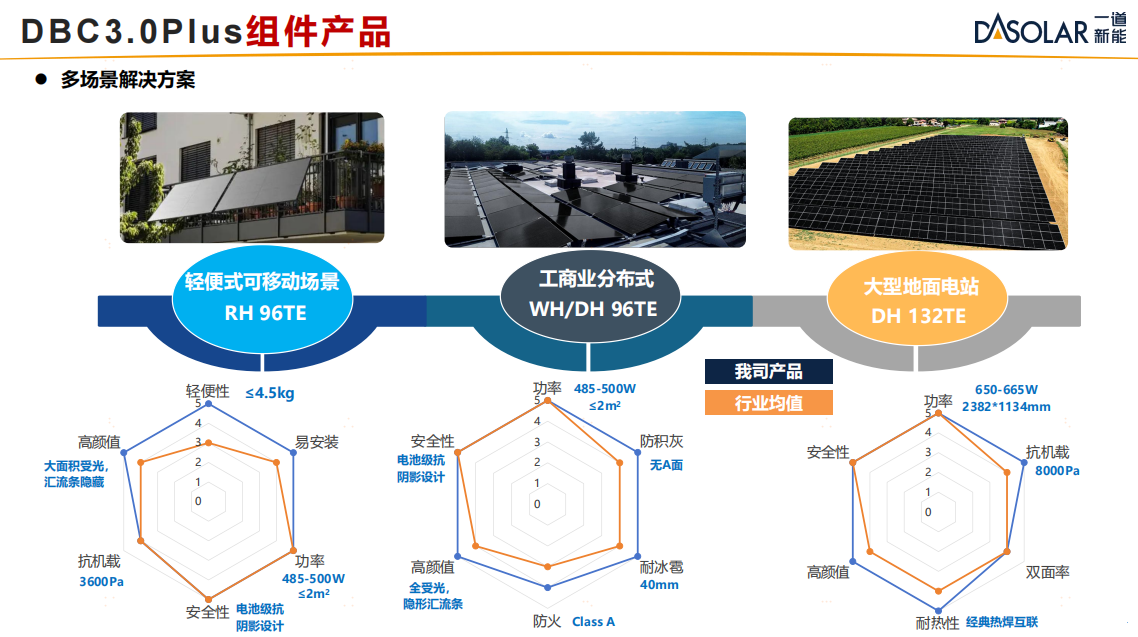 Diamond“黑曜”DBC3.0Plus组件凭借全背面电极结构优势,正面无栅线与焊带遮挡,搭配全黑正面陷光设计,美学价值与环境适配性兼具,可与建筑立面、户外场景自然融合,广泛适配BIPV、工商业分布式、大型地面电站、轻便式移动场景等多元需求。目前已推出DH132TE(650-685W)、DH96TE(470-500W)等系列产品,其中轻便式RH96TE型号重量≤4.5kg,实用性突出。